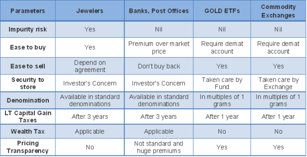 If we try to evaluate different routes to invest in Gold as done in the following table, we can see Gold ETFs and commodities exchanges are the best way to invest in Gold