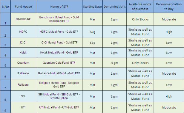 The list of Gold ETFs currently available in market is given below. These Gold ETFs differ on following parameters