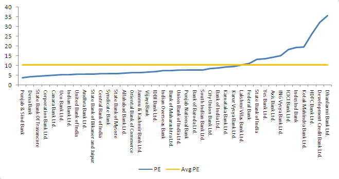 The average PE ratio of the banking industry is ~10.3 but it does not men all the banks with PE ratio less than 10 are attractive or all the banks with PE ratio more than 11 are costlier to buy. One thing you can notice that most of the banks with PE ratio >11 are private sector banks. intuitionally you can say that the private banks are more nimble in its operations and better managed so their earnings growth is better than public sector banks, so its justified.