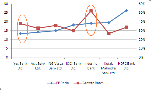 Now the issue is how to select our value pick? Let us see in PE ratio chart we can see among Private sector banks Indusind bank and Yes bank had the strongest performance yet the Yes bank has the Lowest PE multiple and Indusind does not have the highest multiple. This indicates that the upside opportunity in Indusind bank and Yes bank is more likely than any other private bank in list. But one should also read and make sure that the strategy of these banks should be aggressive for next few years to sustain their high growth.