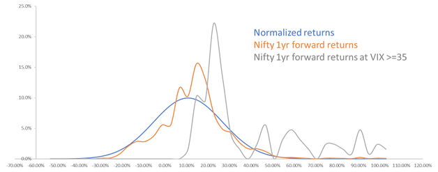 - Grey line is the line of importance for us plotting returns, when VIX has been >=35. The returns distribution shifted right, which means that the chances of negative returns reduces and chances of large positive returns are increased accordingly. The geometric mean shifts to whopping 35% with Median returns of ~25%