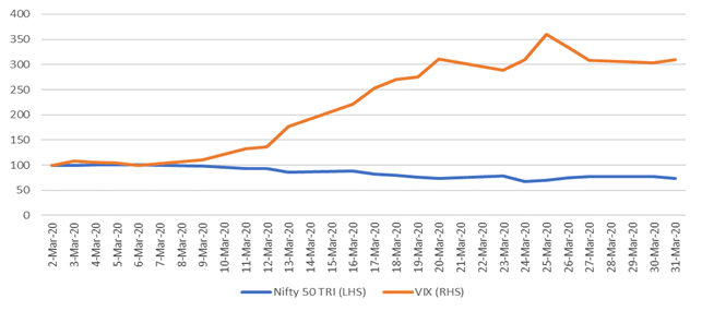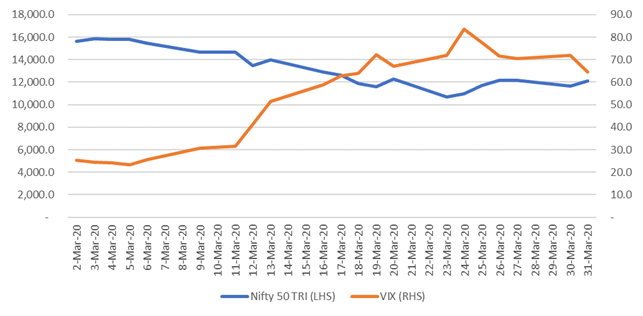 Chart 1: shows the actual value of Nifty 50 TRI and India VIX. The Nifty 50 TRI moved from 15,632 to 12,105 in the month of March, while the VIX has moved up from 25.2 to 64.4 in the same month.