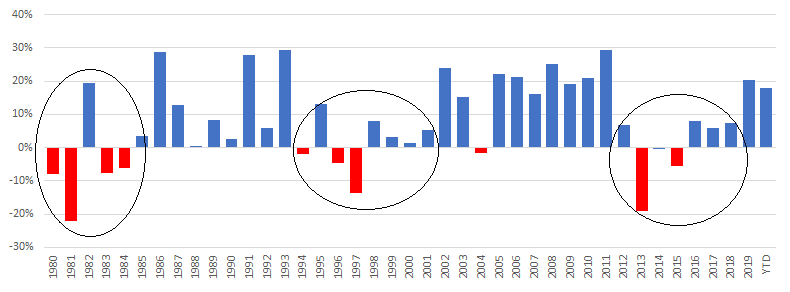 The returns have not been linear and have come in cycles; a series of years with negative or low returns followed by higher returns. Below chart shows the Annual returns for each year since 1980 to 2020 YTD. The periods in circle can be very disheartening for investors to get away from gold as investment class, which was the case from 2012-2018. People have often started calling Gold as the dead asset and to be ignored.