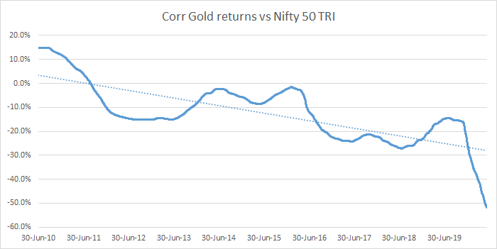 To re-iterate and re-emphasize the point on negative correlation; It is not constant and it is increasingly negative over the last two decades. Let me share the below chart: it shows the correlation measured between the annual rolling returns of equities with annual rolling returns of gold. Data reviewed is from Jun 1999 to Jun 2020. the first point of correlation is measured for annual rolling returns of Nifty 50 TRI & Gold from Jun 2000 – 2010.