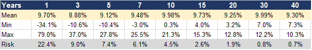 Though that is not the case, as the gold is back with a bang and is all set to top the chart of returns among other asset classes for the second year in a row. (Check this) If the gold does not give linear returns then let’s look at its returns/ risk characteristics. The below table shows that the one year returns of the gold could be quite volatile and can be anything between -34% from 79%. Even though the mean returns range across the holding periods for 9-10% but the volatility reduces for the longer holding periods.