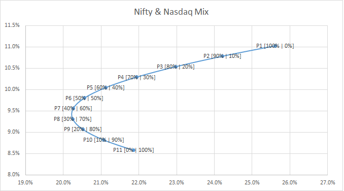 In the above chart, I have plotted 11 portfolio combinations, P1 is 100% Nifty to P11 is 100% Nasdaq. As you move across the Portfolios, you would notice that we would keep on reducing the volatility with increasing mix to Nasdaq and sacrifice some returns in process. This characteristic appears due to lower correlation (approx. 0.5) between these indexes rolling returns over the analyzed period. P4 (70% Nifty : 30% Nasdaq) has a similar volatility to Nasdaq index but adds +180bps on the returns, This means the investors should have higher exposure to Nifty to get a better risk adjusted returns. In real life, the correlations are not constant but dynamic and the realized benefit might be lower than expected as per the above chart.