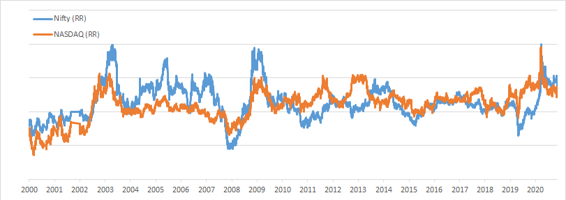 In terms of risk, The returns of Nifty as well as Nasdaq has been quite volatile. Nifty returns have ranged between +99.4% to -55.5% vs the Nasdaq returns range of +95.5% to -64.3%. In terms of Max drawdown during the analyze period, Nifty had the worst drawdown of -59.4% vs -75.5% for the Nasdaq. Yes, That’s correct the Nasdaq had lost 3/4th of It’s value during the Tech bubble burst in 2000-01 period. In terms of Standard deviation, Nasdaq is slightly better off with 21.9% vs 25.6% of Nifty. Based on these data points, Nasdaq is less volatile but has higher drawdowns & swings to negative.